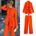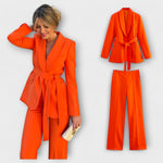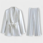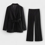 Odkryj ostateczny styl i komfort z naszym zestawem Lena dla kobiet. Ten dwuczęściowy zestaw składa się z długiej kurtki z paskiem, która podkreśla talię oraz dopasowanych spodni – idealny na okazje formalne i casualowe. Wykonany z wysokiej jakości materiałów, które zapewniają oddychalność i komfort, zarówno w biurze, jak i na kolacji.