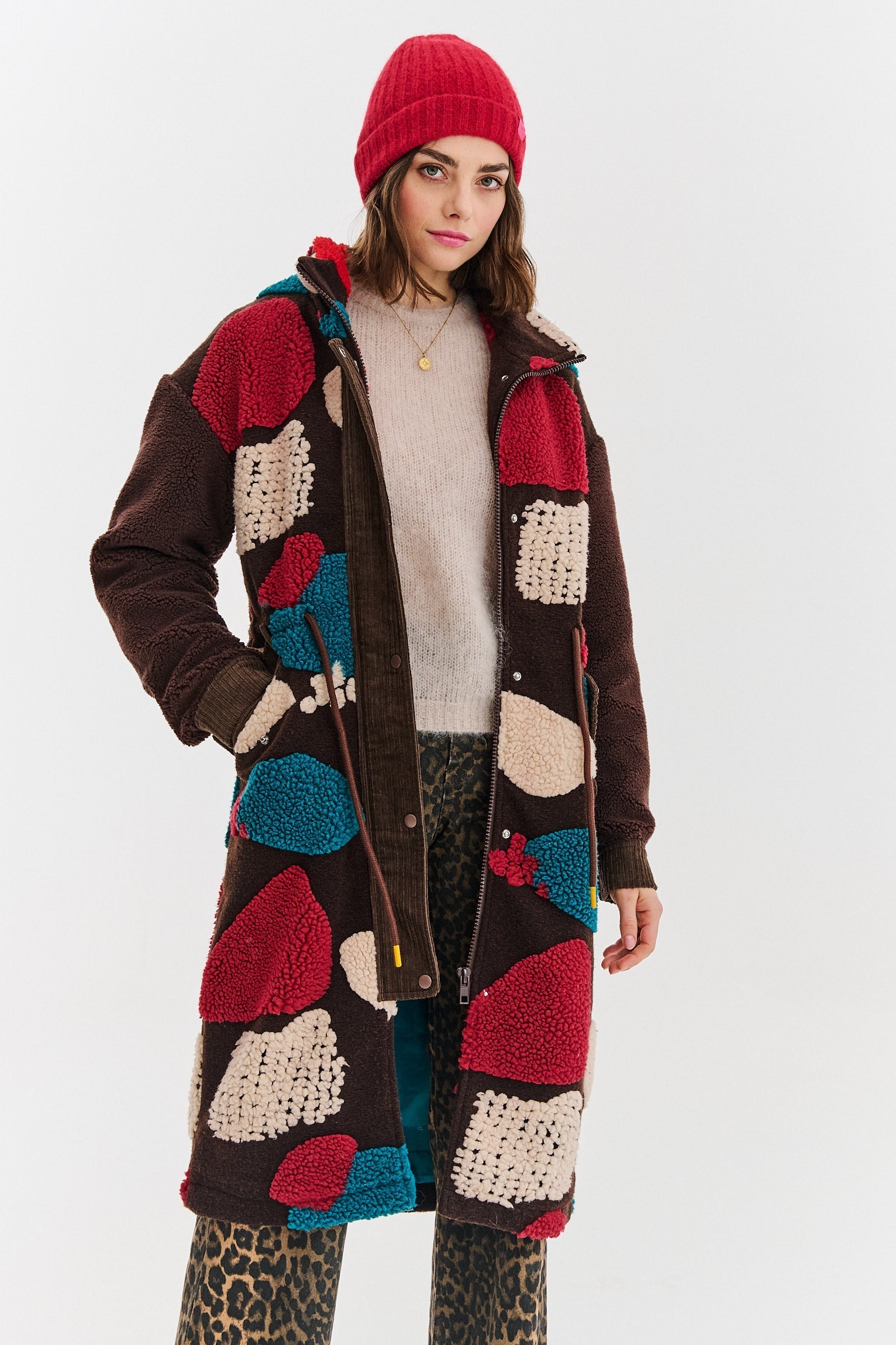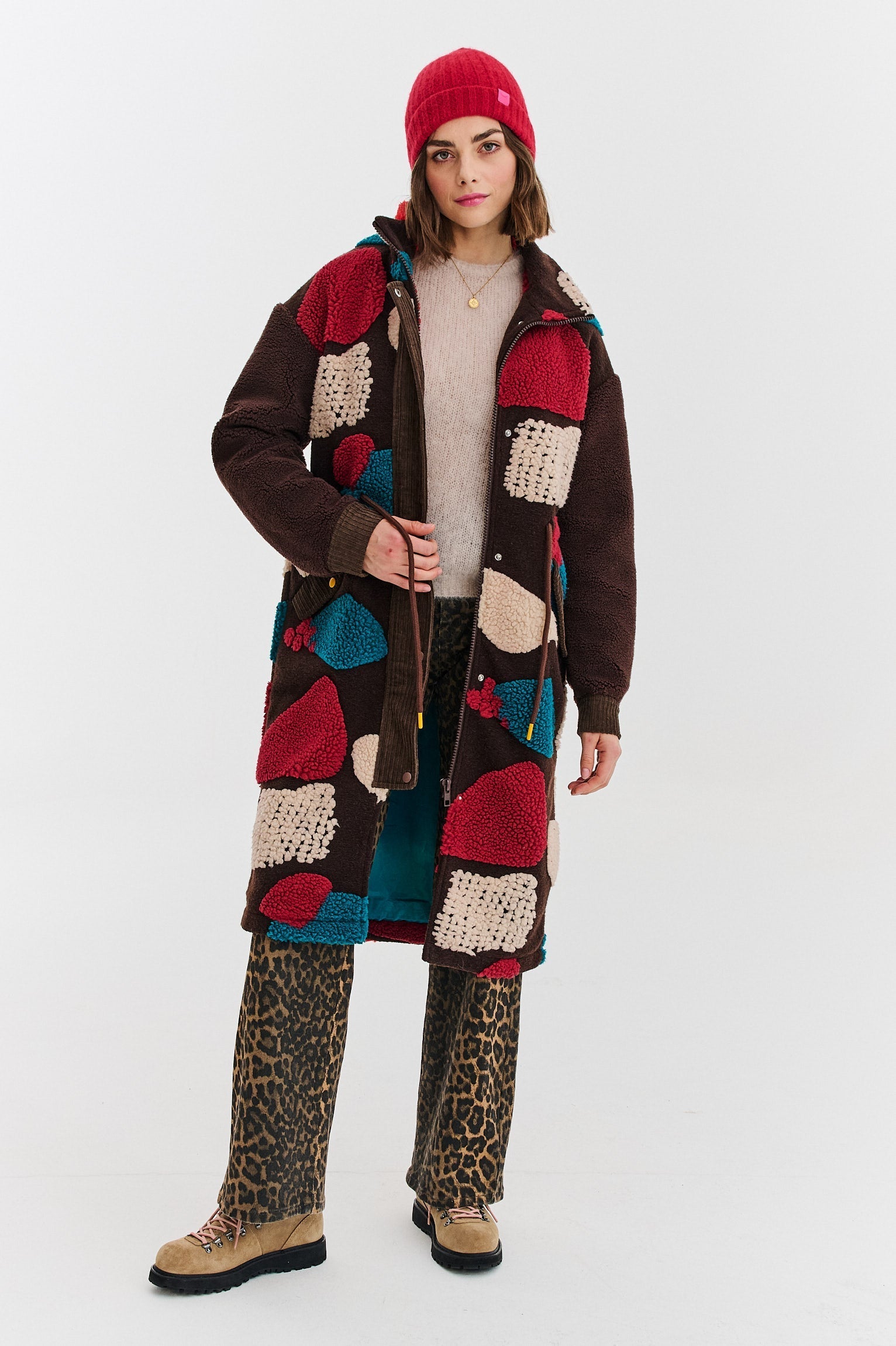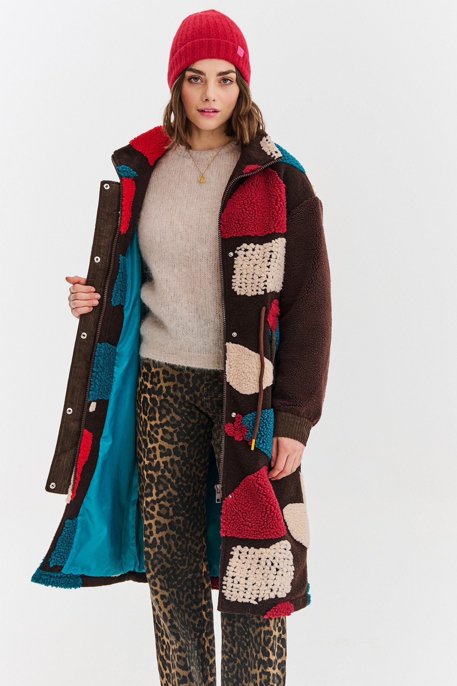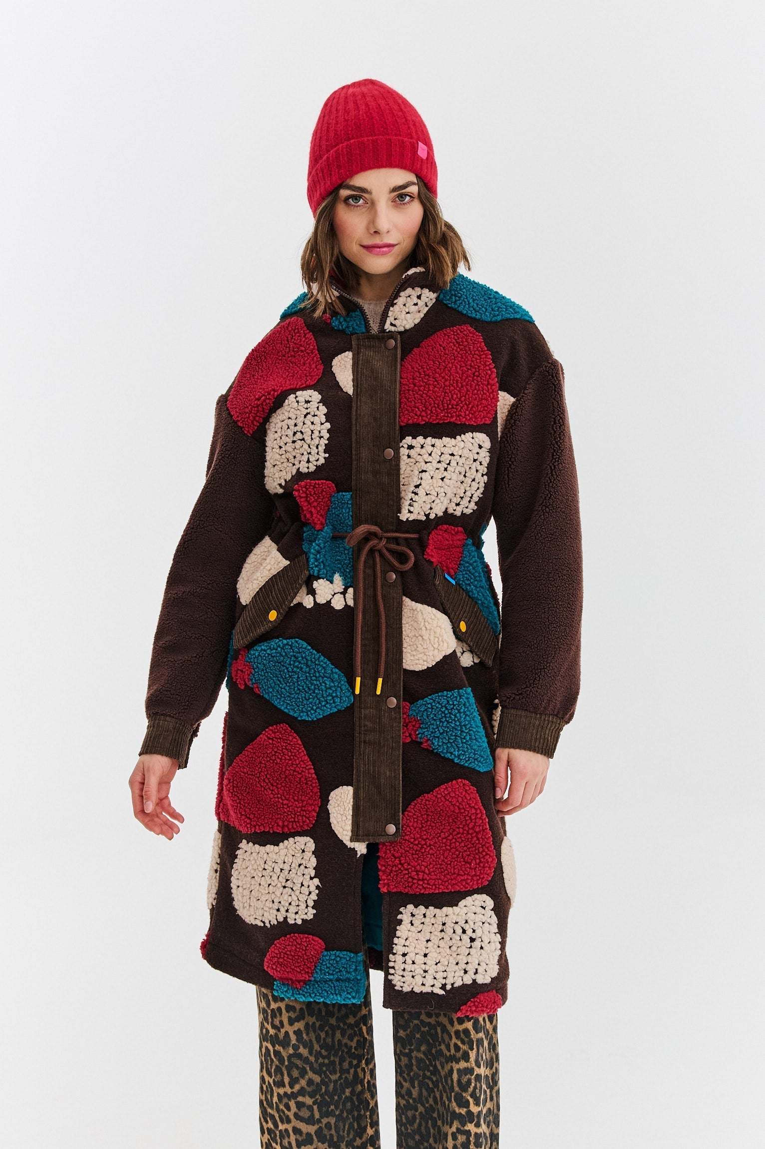 Płaszcz Teddy Jungle Confetti to prawdziwa eksplozja kolorów, faktur i oryginalności. Artystyczny patchwork w połączeniu z miękkim, przytulnym materiałem teddy tworzy wyjątkową część garderoby o silnym charakterze. Luźny krój i wydłużona forma zapewniają maksymalny komfort, a kolorowe detale nadają nowoczesnego, wyrazistego wyglądu.