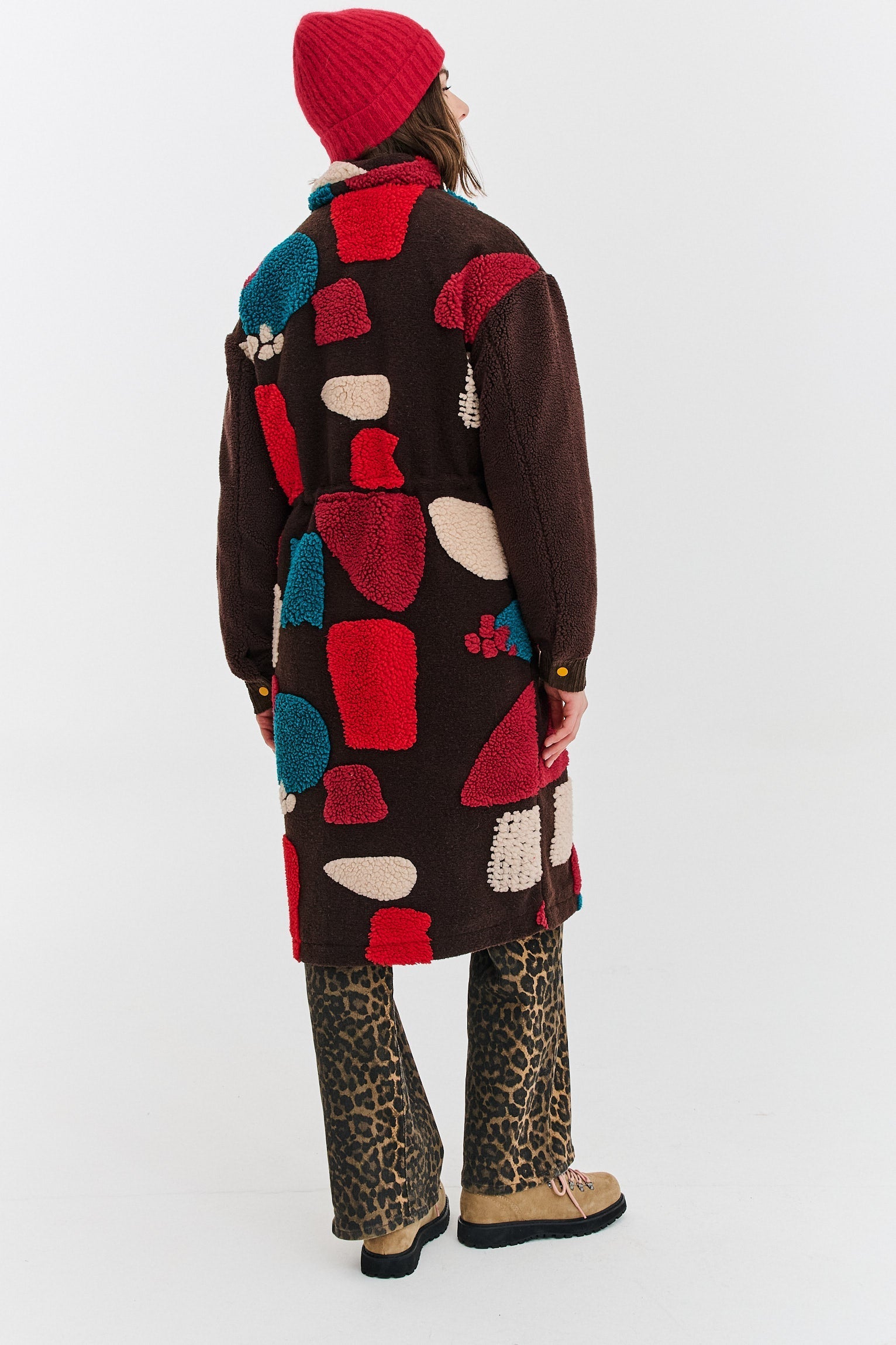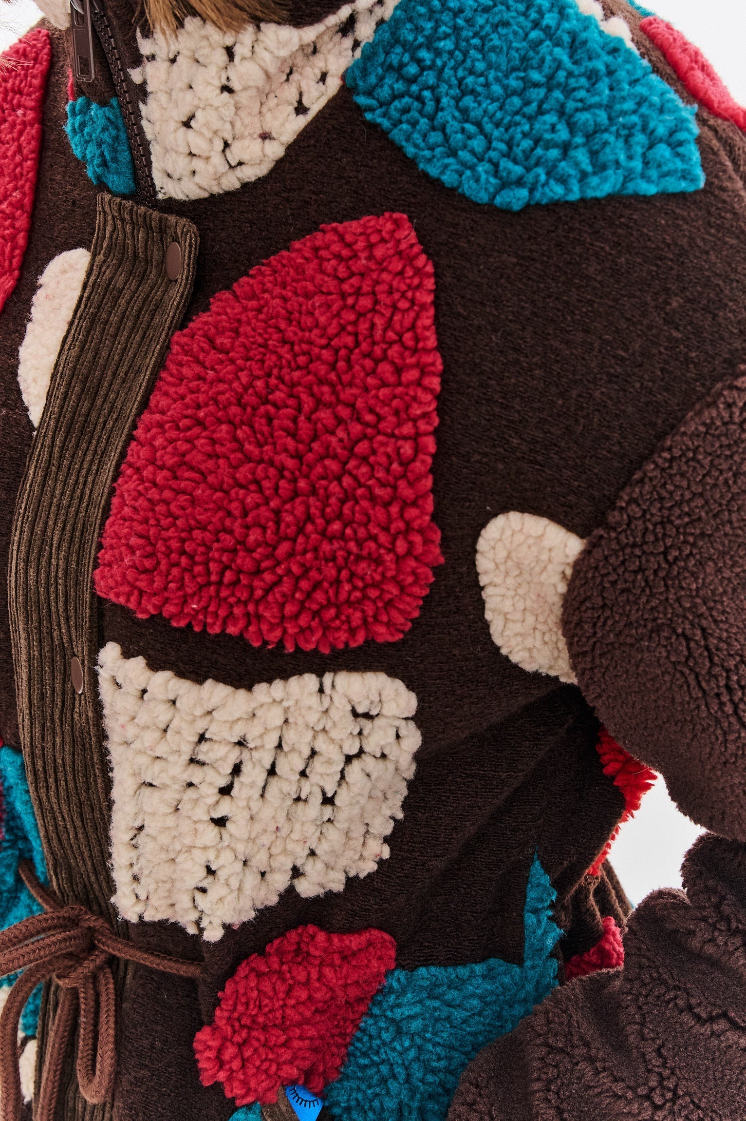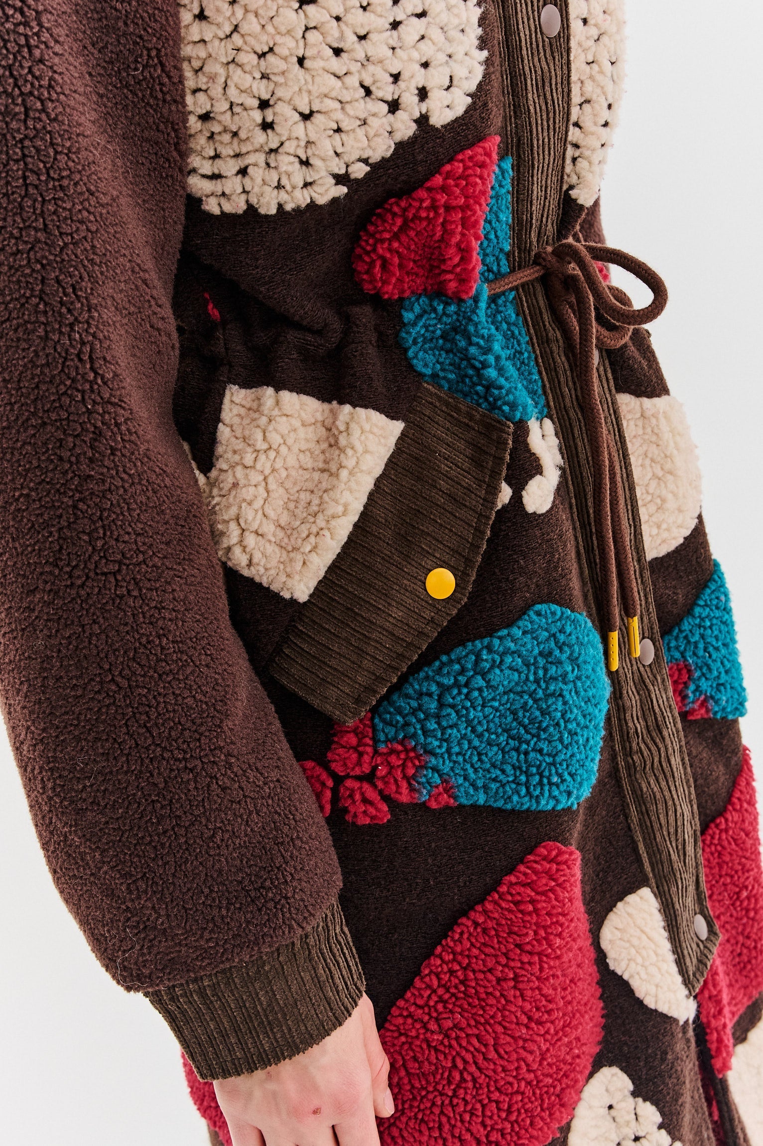Płaszcz Teddy Jungle Confetti to prawdziwa eksplozja kolorów, faktur i oryginalności. Artystyczny patchwork w połączeniu z miękkim, przytulnym materiałem teddy tworzy wyjątkową część garderoby o silnym charakterze. Luźny krój i wydłużona forma zapewniają maksymalny komfort, a kolorowe detale nadają nowoczesnego, wyrazistego wyglądu.